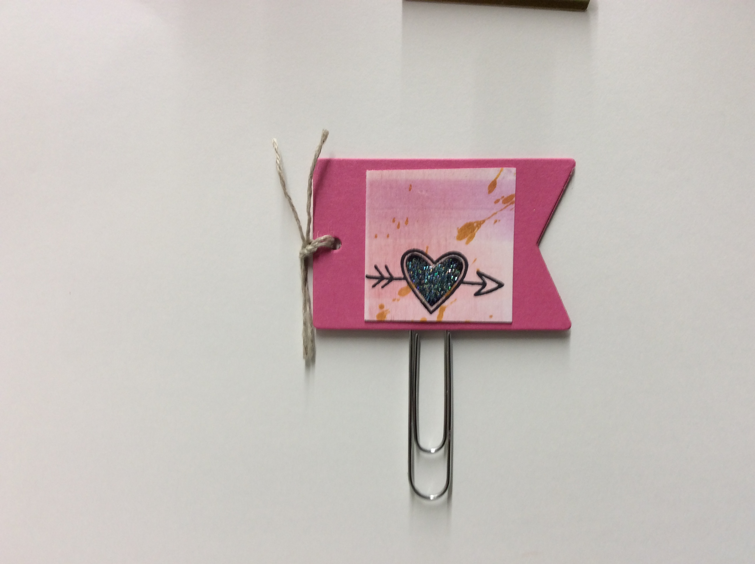 Using Watermelon Fusion card stock cut 2 pieces with the Everyday Tags DI-0255 . Using the E6000 glue, glue together just the top portion of Clip,with Jumbo Paperclip in the middle forming a sandwich. Let dry completely then assemble with a square piece of WhipCream card stock that has been washed with pan pastels in a plaid formation and sprinkled with Gold Silk. Cut into 1 1/4 inch square and stamp with Black Licorace Ink using the Stamp Set Planner Elements SS-0402. Using the picture as your guide. Decorate the inside of the heart with Journey Glaze and Journey Sparkle Dust. Let dry and finally using Natural Journey Thread tie a cute knot in the punched out circle.
