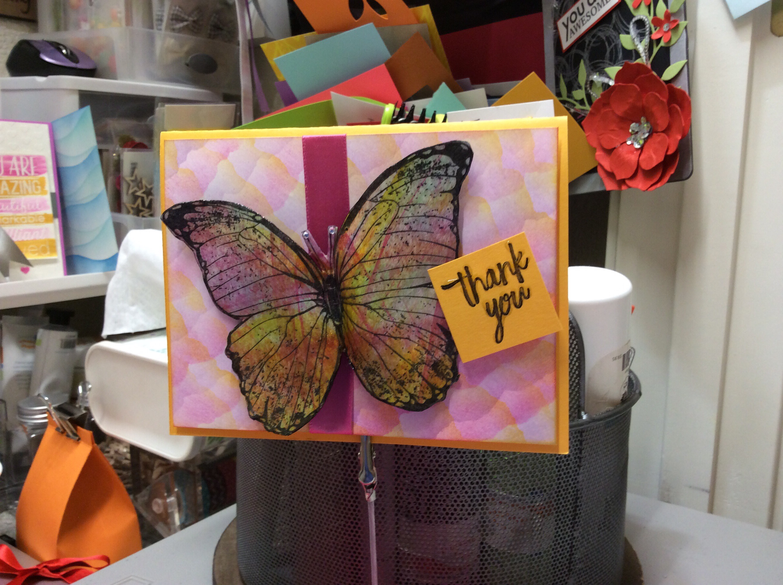 Adhere a piece, 7 inches of Watermelon Fusion Satin Ribbon to finished WhipCream piece of the Waterfall technique, the finished ink to paper piece to the Summer Days with Journey Easy Glide Adhesive and then using Foam Square (medium) adhear the butterfly to the card front. I used a little Journey Craft Glue to make it more stable. Adhear the sentiment with Foam Squares and you are done! Enjoy.