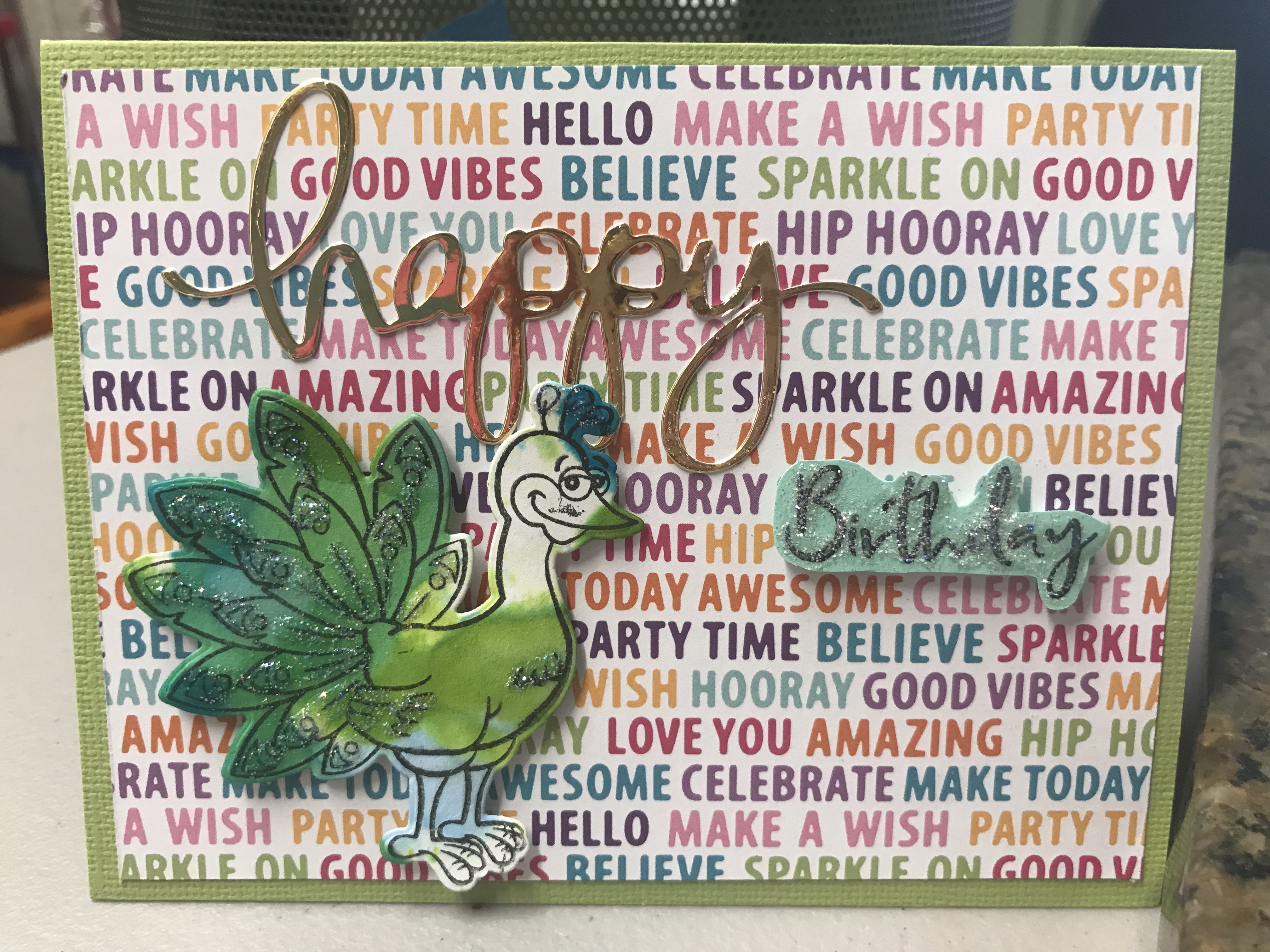 Cardstock and ink from FSJ, Stamp Set #UC001 Peacock from InkyStamper.com. Misc. Stamp Set with text and die cut from Mama Elephant.