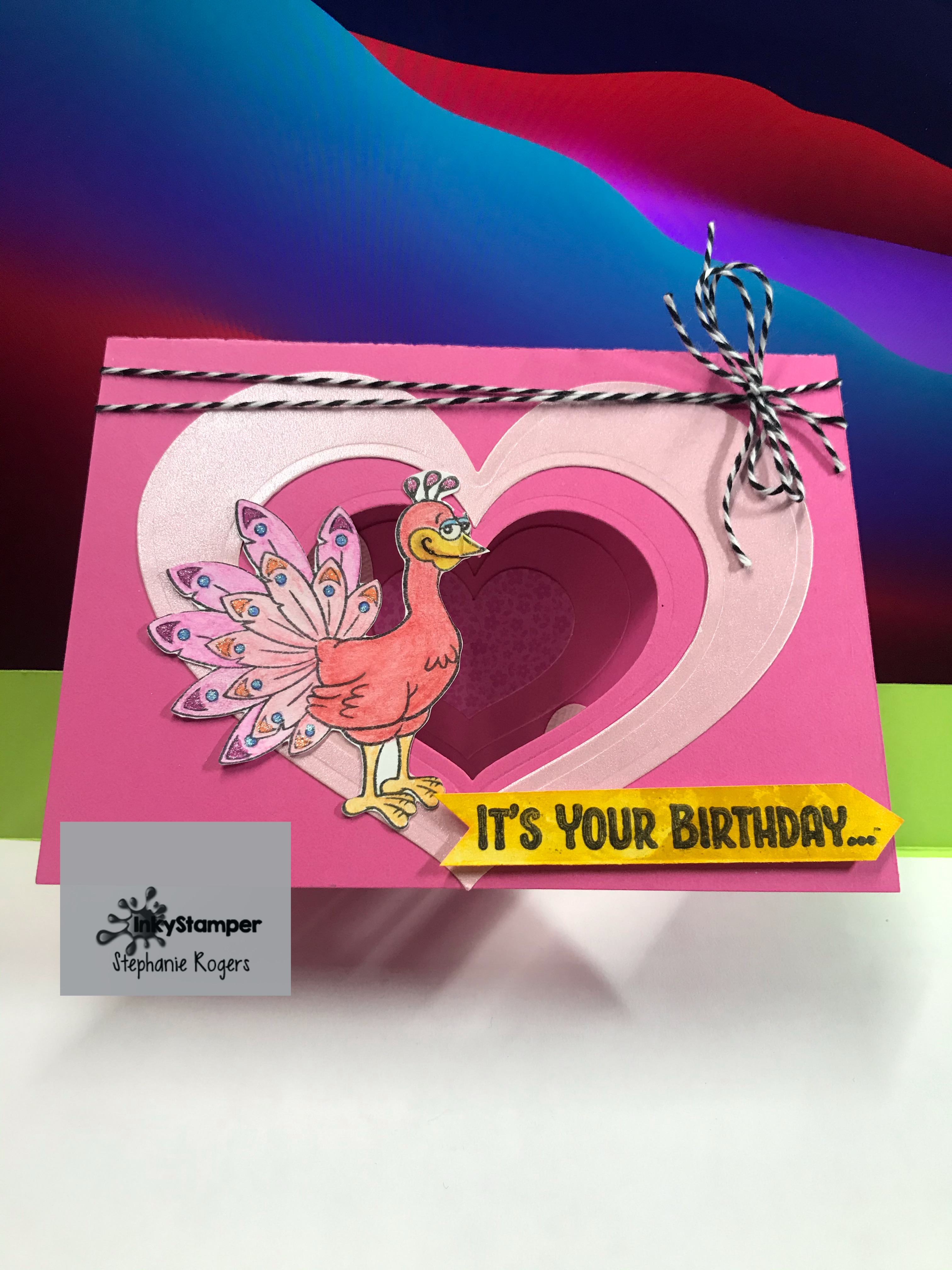 Todays creation from my CraftRoom was made with InkyStamper’s Peacock Stamp on paper from my stash. I colored her with Nuvo Watercolour Pencils and Nuvo Glitter Markers. The card was also made with paper from my stash, doodlebug design 6×6 paper and Spellbinders Heartfelt Nesting Dies. The Sentiment was inked up on white cardstock that was layered with TCW Gamboge Stencil Butter. I completed the look with Bakers Twine and Nuvo Crystal Glaze.