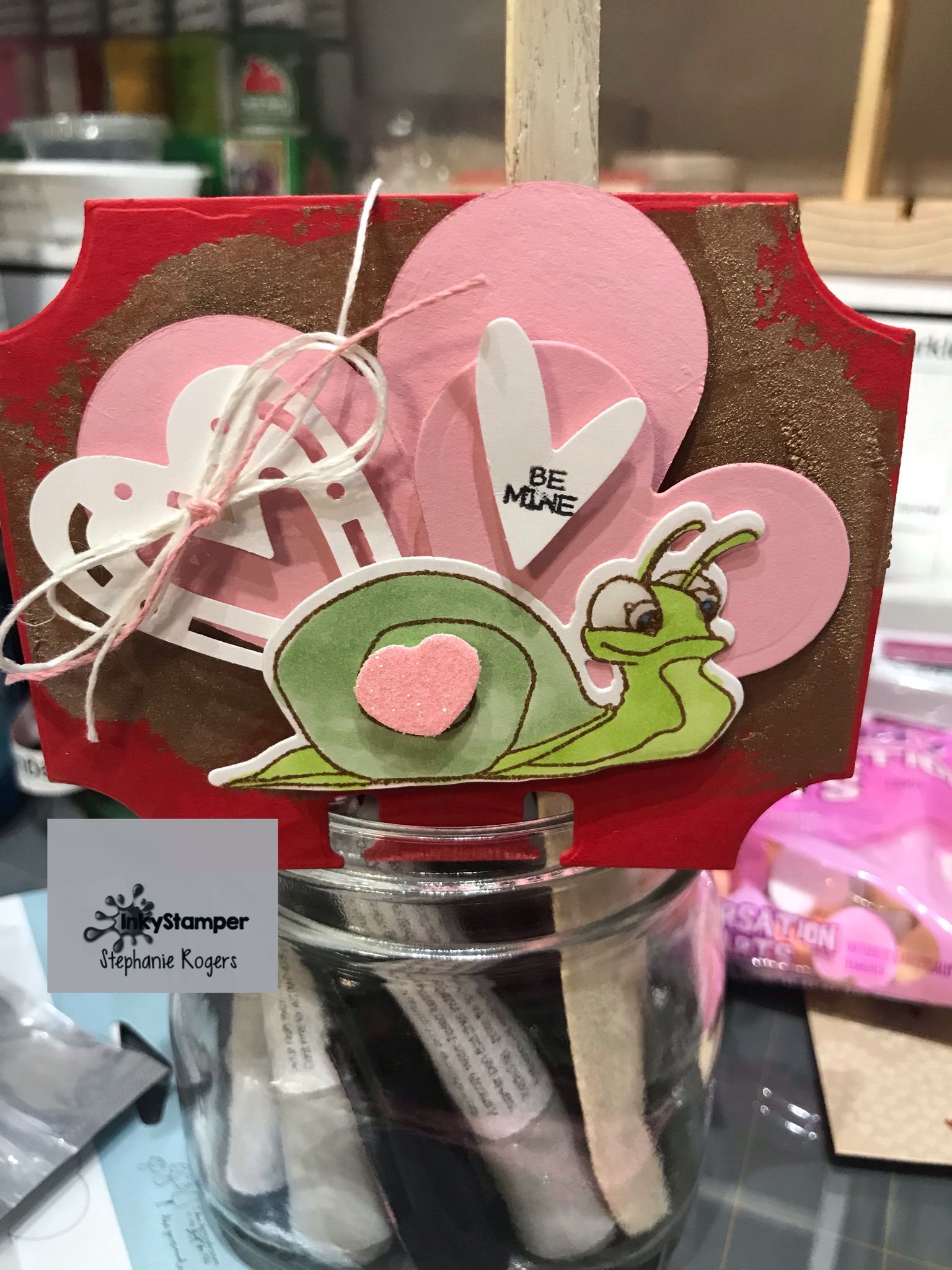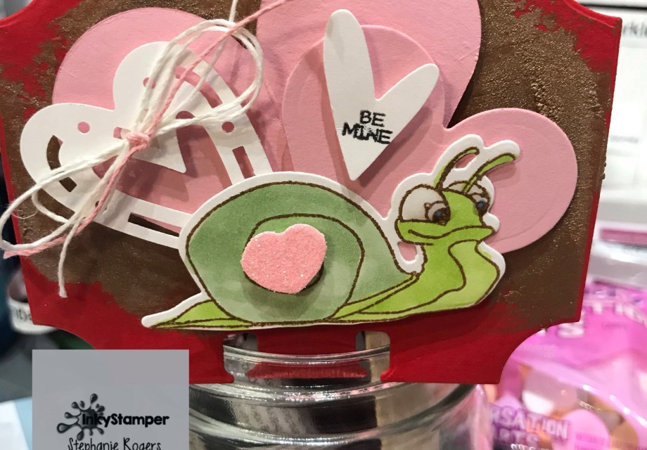 All paper is from my stash, the main Rolodex card is die cut with a Heidi Swap Die. Hearts were die cut with Spellbinders Nestabilities Heart Dies, punches retired from Creative Memories and Snail Stamp and Die set from InkyStamper. Stamped with Nuvo Ink- Acorn Brown, colored with Copic Sketch Markers and embellished with Nuvo Expanding Mousse- Mustard Seed and Nuvo’s Crystal Glaze and Twine from my stash.