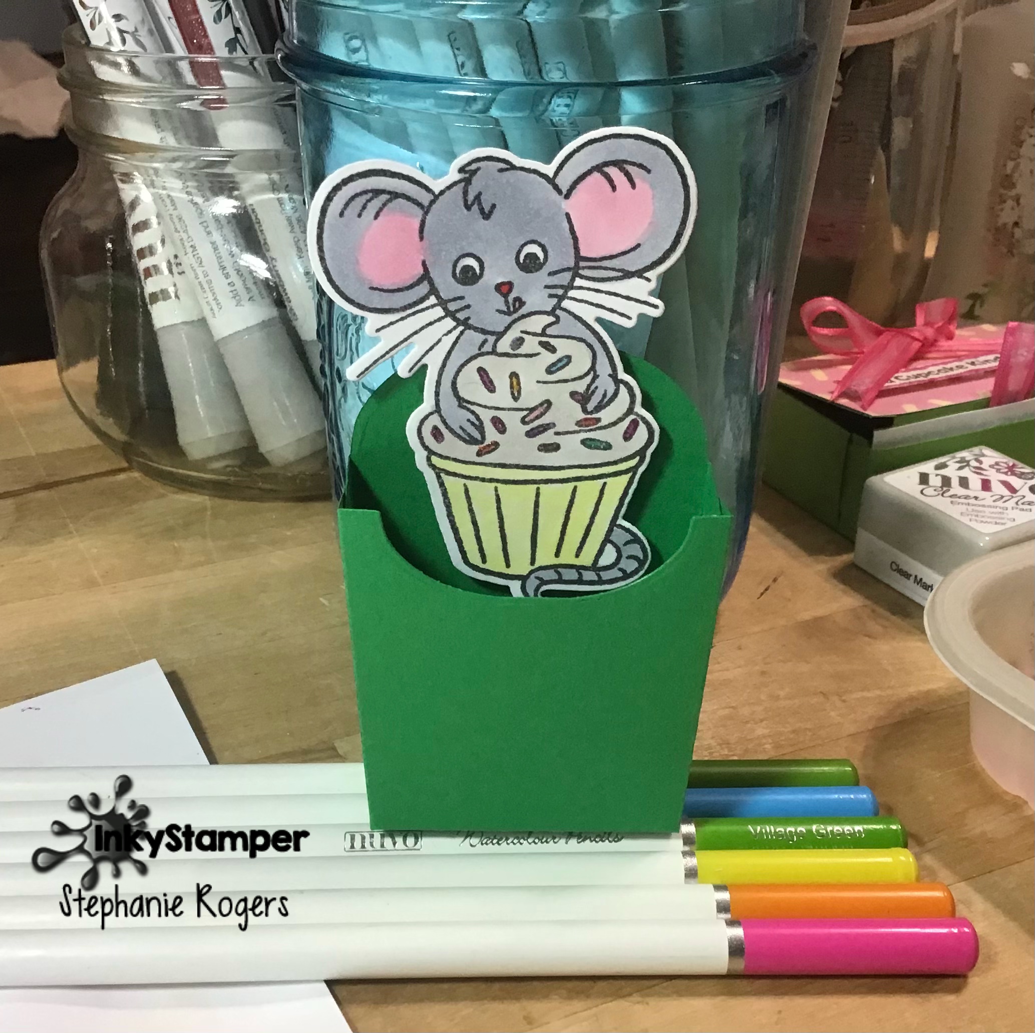 All card stock from my miscellaneous stuff bin. Ralph the Mouse from the InkyStamper Stamp and die Set, cut out and colored with Copic Sketch Markers, Nuvo’s Glitter Markers and finished with Nuvo’s Crystal Glaze. Fry box is too, from InkyStamper.