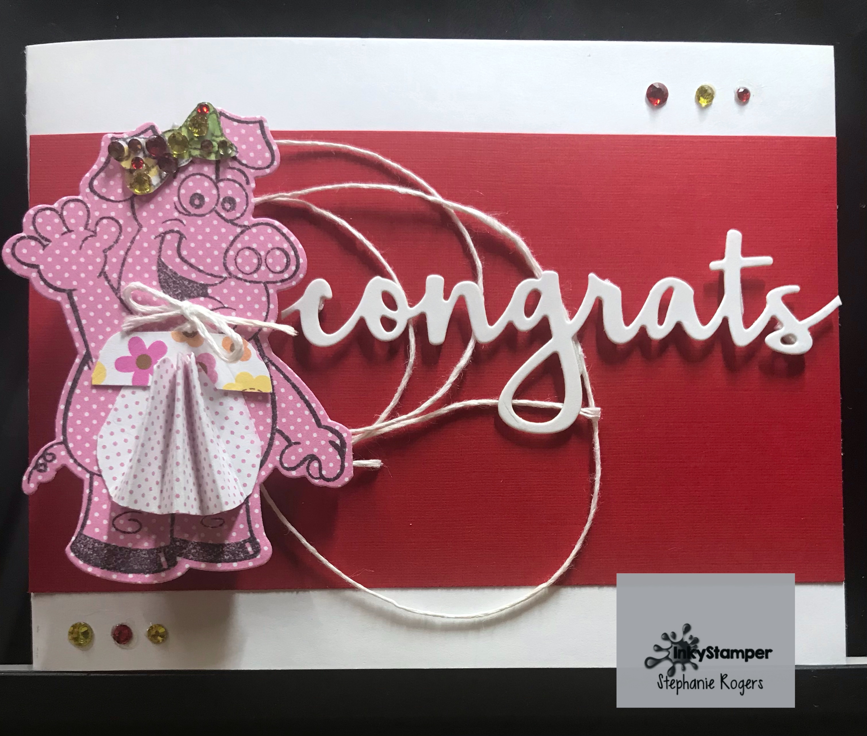 I used scraps from my scrap box to make the whole card! Neenah paper card base and doodle bug Swiss Dot paper for Ms Pig. I stamped the image from InkyStampers Pig Stamp and Die set with Nuvo’s Black Shadow Ink and blinged her bow, from InkyStampers Bunny Stamp and Die set, with Picket Fences Gem mix- Fire. I completed the card with a sentiment from my stash and White twine.