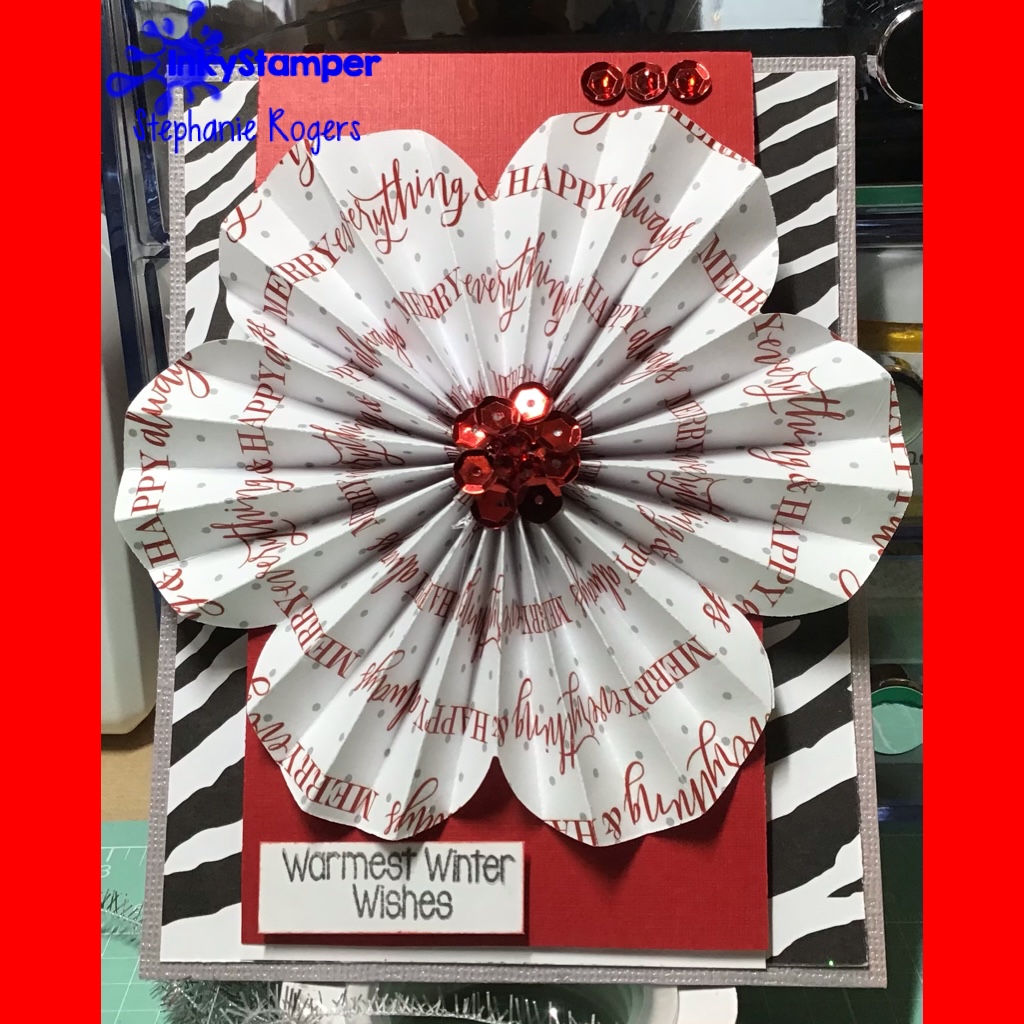 I cut the Flowerette die from paper I have had in my paper collection and then folded into this pretty rosette and embellished it with Sequins from my collection and Gems from Picket Fence Studio -Fire. placing it on the red flap creating the card.