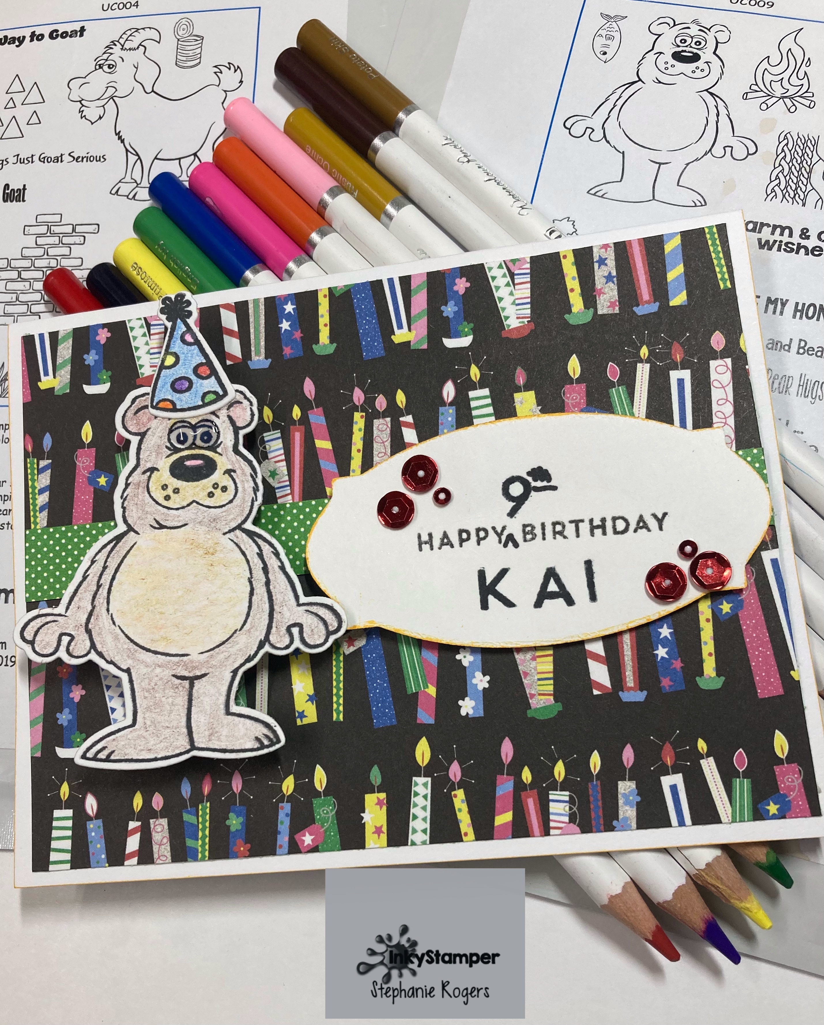 I made this an A2 card from Neenah White for the card base and the sentiment shape and Bear. All image Stamps are by InkyStamper using the Bear Stamp and Goat stamp for the hat. I used the Happy Birthday sentiment from my collection along with the Little Letter Stamp set from Concord &9th for the personalization, all stamped with Memento Tuxedo Black Ink and colored with Nuvo’s Watercolour Pencils: Roast Chestnut,Rustic Ochre,African Violet, Cotton Candy, English Ivy,Toffee Apple,True Blue, Tangarine Tango, Evening Primrose,Strawberry Milkshake and Potato Skin and distressing on the sentiment die cut with Nuvo’s Hybrid ink, Rubber Duck. The background layer is from Photo Play paper and the stripe is from Doodlebug Design’s Swiss Dot Rainbow Petite Print paper. I completed the card by using Red sequins from my stash and Nuvo’s Crystal Glaze. Mr. Birthday Bear is affixed to the card with a Wobble so he wiggles.