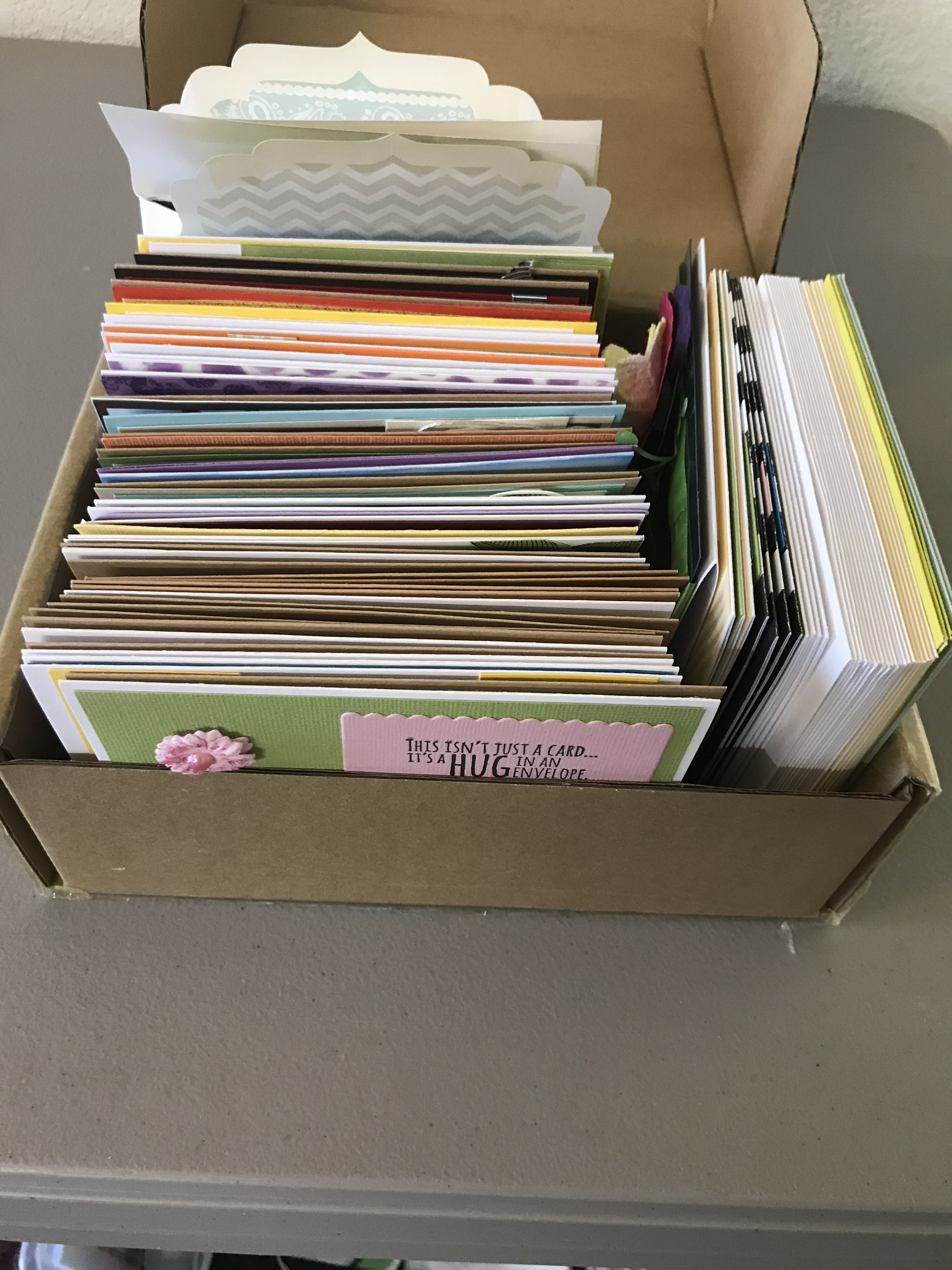 60 cards and envelopes finished for people shut in at a nursing home. Thanks to all of my friends, over the years, that have made card fronts and Artist Trading cards for crafting/ card making conventions.