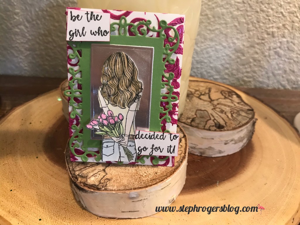 The Artist Trading Cards were created with paper from my collection, the wallpaper was achieved with Modeling paste by The Crafters Workshop and a stencil, too from my collection. The frame and mirror were made with dies from Spellbinders and the Girl with Flowers Stamp from Unity Stamps inked up with Momento’s Tuxedo Black ink. I colored the girl with Nuvo’s Watercolour Pencils and completed the look with Glitter ink.