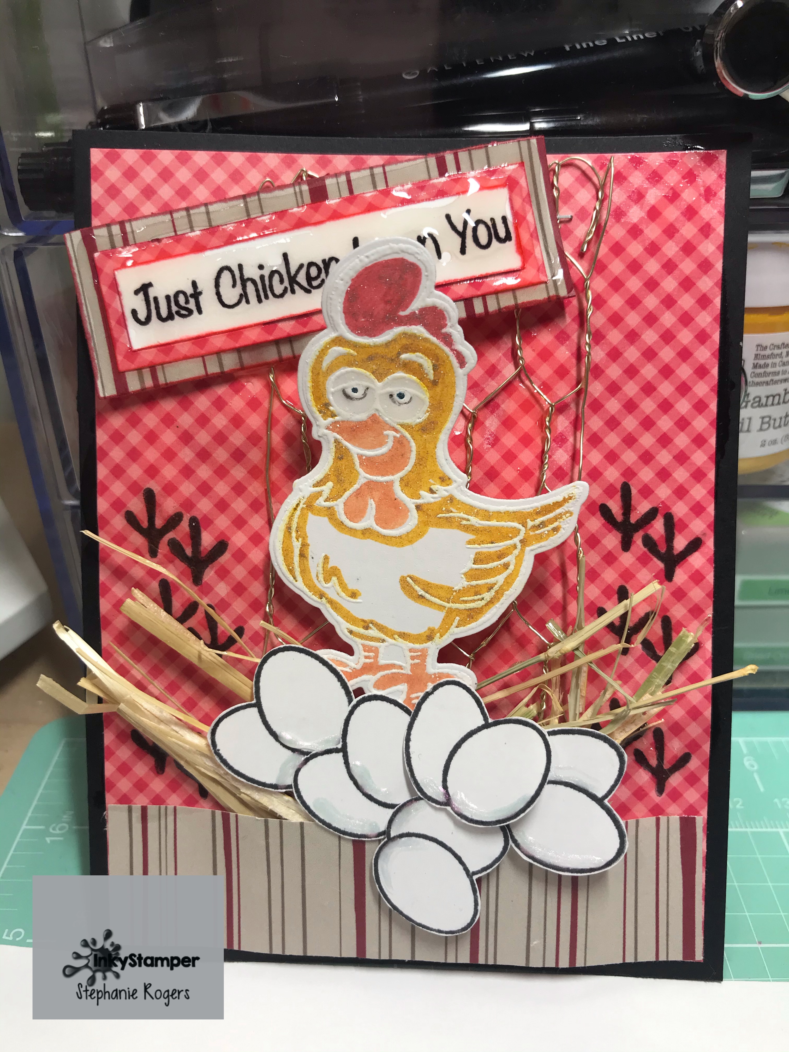 Ms.Chicken is just ‘Chicken in on you’ for National Poultry Day. She was created with paper from my collection, stamped with the Chicken Stamp by InkyStamper with Momento’s Tuxedo Black ink and colored with Nuvo’s Glitter Markers. I completed the card with chicken wire, real hay and Nuvo Drops.