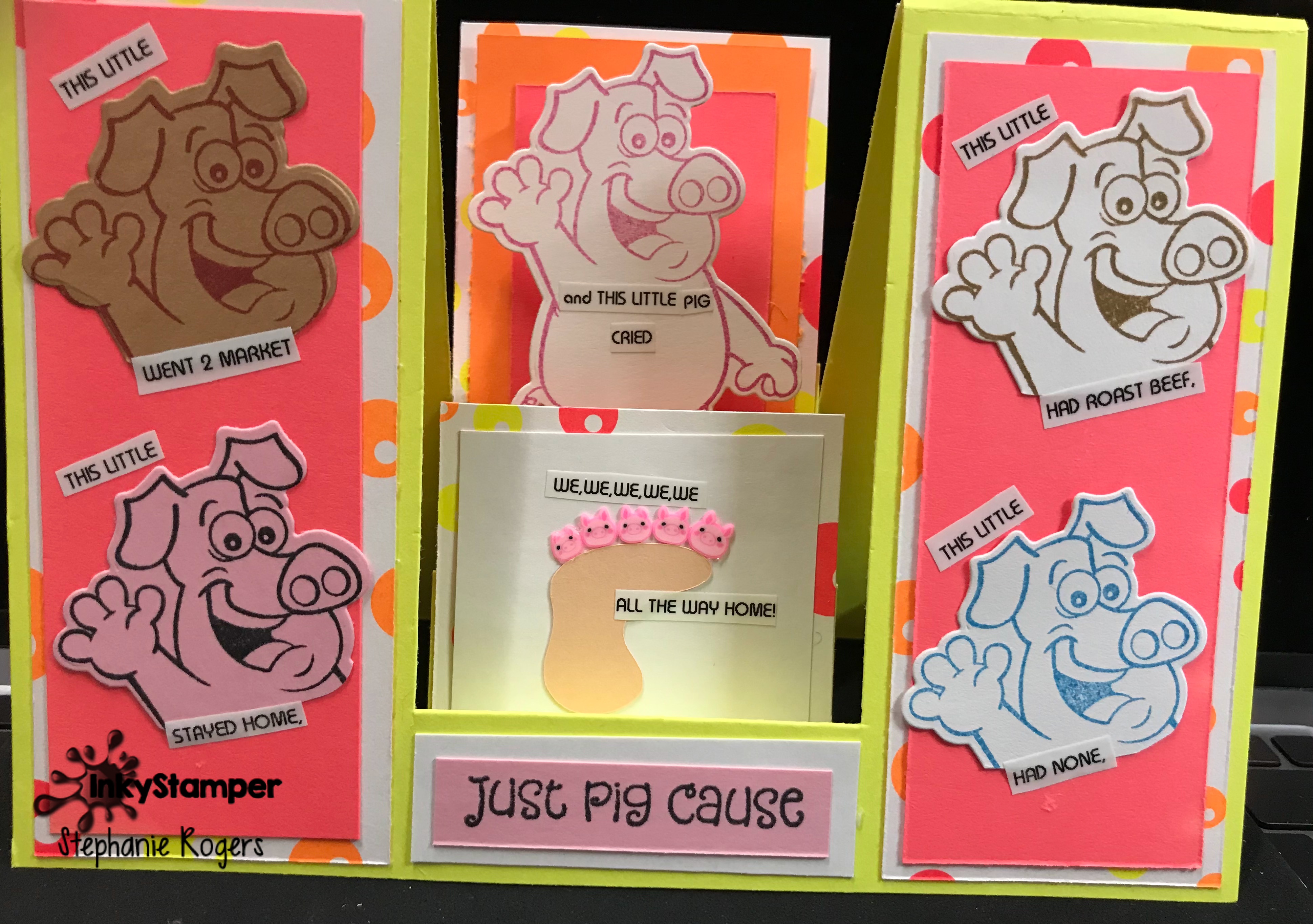 This card was created with cardstock from my collection after watching many YouTube videos for step fold cards. I used the InkyStamper Pig Cause Stamp and Die inked up with retired inks from Fun Stampers Journey and Piggy embellishments by Dress my Craft. The rhyme was created on my Brother Label Maker.