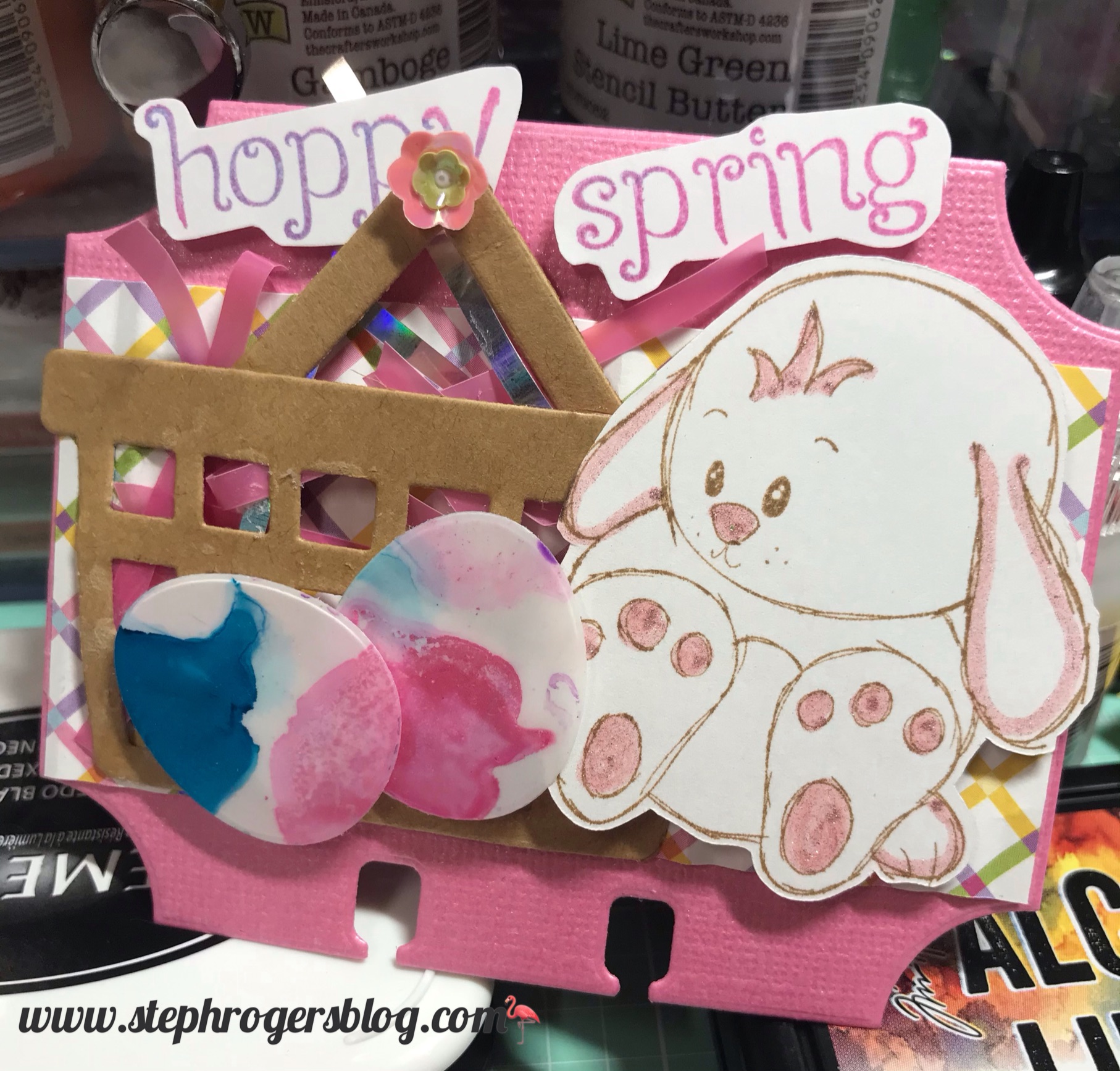 The Memorydex card was created by die cutting the cards with HeidiSwapp’s die from paper in my collection. I used cute spring colored paper and made it have texture by running through my corregator tool. I cut Easter grass in small pieces and glued them to the underside of a die cut basket and then glued to my background piece. I stamped the bunny image from a retired stamp set from FunStampersJourney with Nuvo’s Acorn Ink on Neenah white cardstock, coloring the bunny with Nuvo’s Glitter Markers. I embellished the card with sequins from my collection and stamped the sentiment with a custom multicolored stamp pad.