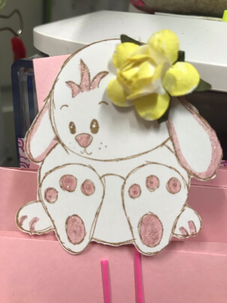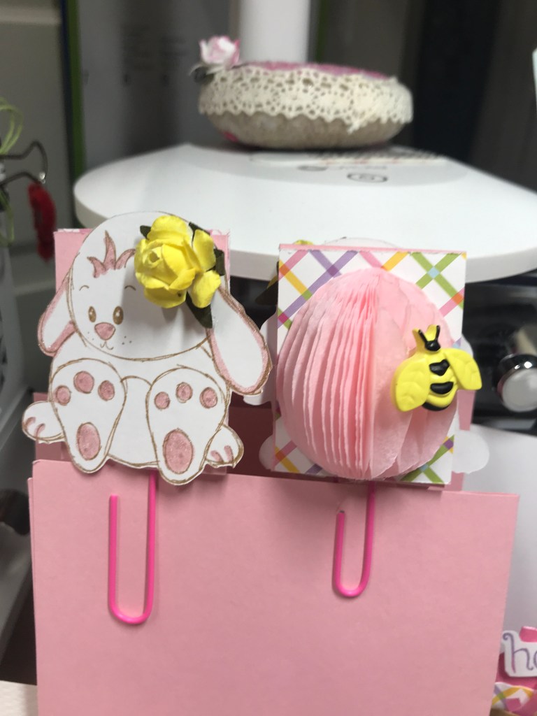 I created this planner clip with paper from my collection and stamped the bunny image, retired stamp fromFun Stampers Journey, with Nuvo’s Acorn Brown Ink and colored the image with Nuvo’s Metallic Markers. I created the egg with Honey Pop paper from Inky Antics. I completed the clip with a cute Bee Button and a paper flower colored with Copic Sketch Markers.