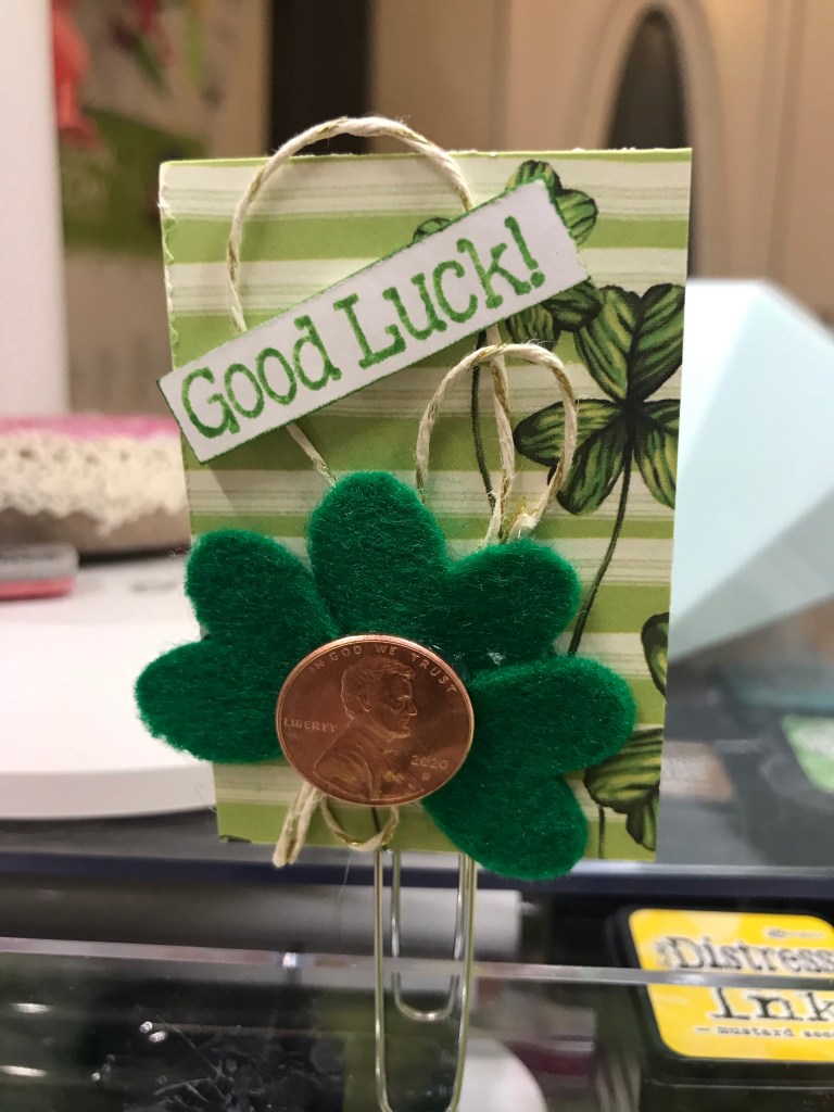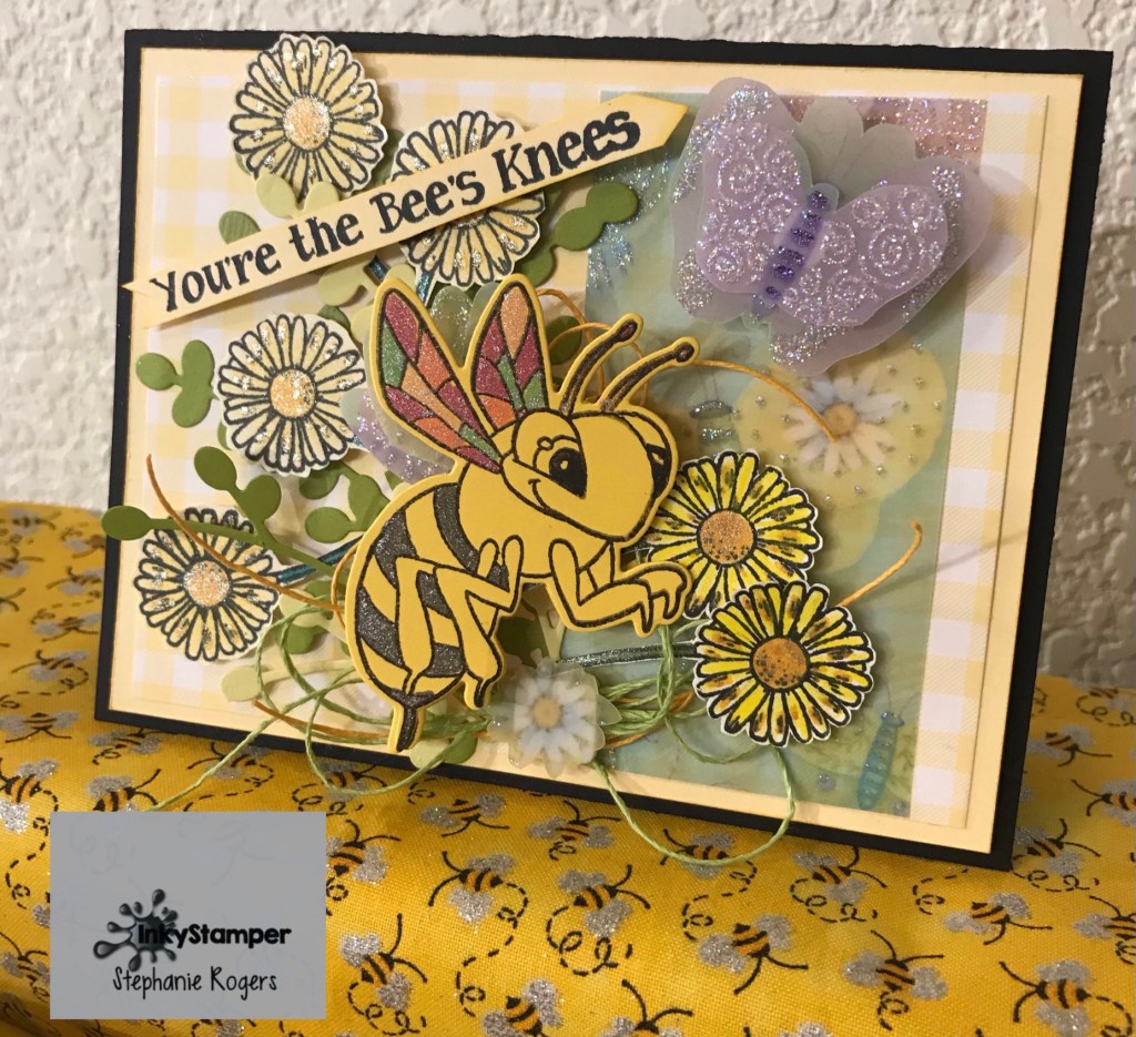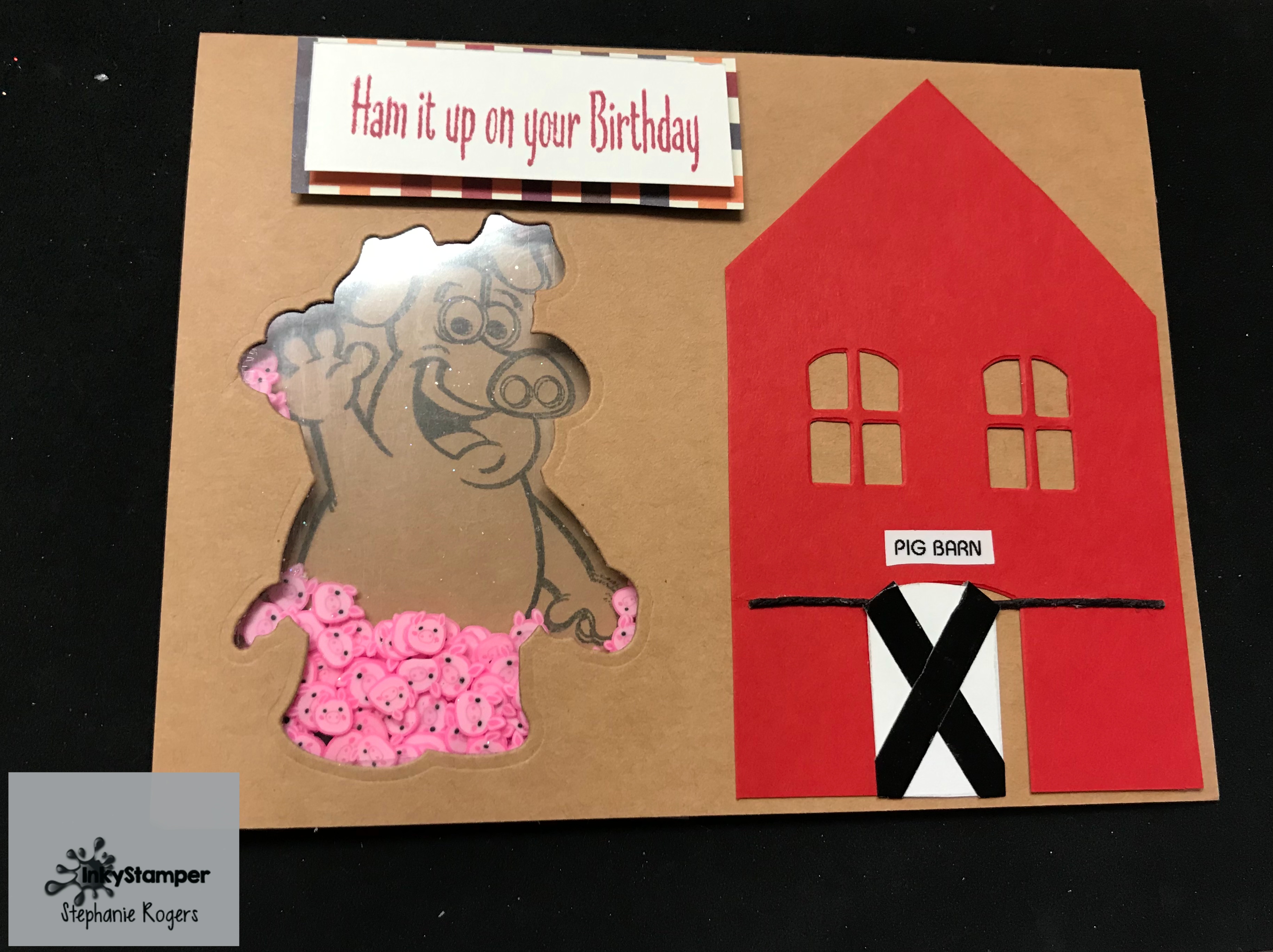 I created this shaker card with cardstock from my stash. I cut the Pig with the die from the Pig Cause Stamp and Die set and then inked it up with Mementos Tuxedo Black ink and then created the shaker card with acetate and foam tape filling it with Pink Piggy embellishments. I also used washi tape and twine from my embellishment collection.